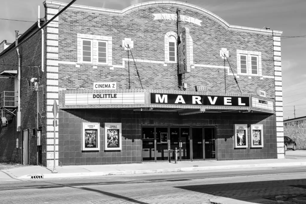 On West Main Street, the Marvel Theatre still holds its ground. It first opened in 1920, built by Frank and Frieda Paul as a movie palace for silent films. It could seat almost 900 people and even had room for live music.
