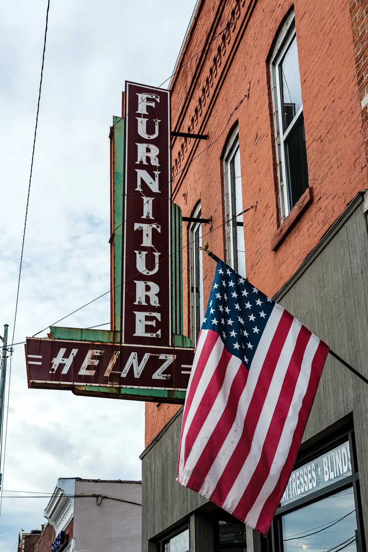 My 2020 photo captured Heinz’s sign with the American flag — a mix of mid-century neon and small-town tradition now gone from the façade. Photographed February 3, 2020 © RJL Creative LLC. Use without permission is strictly prohibited.