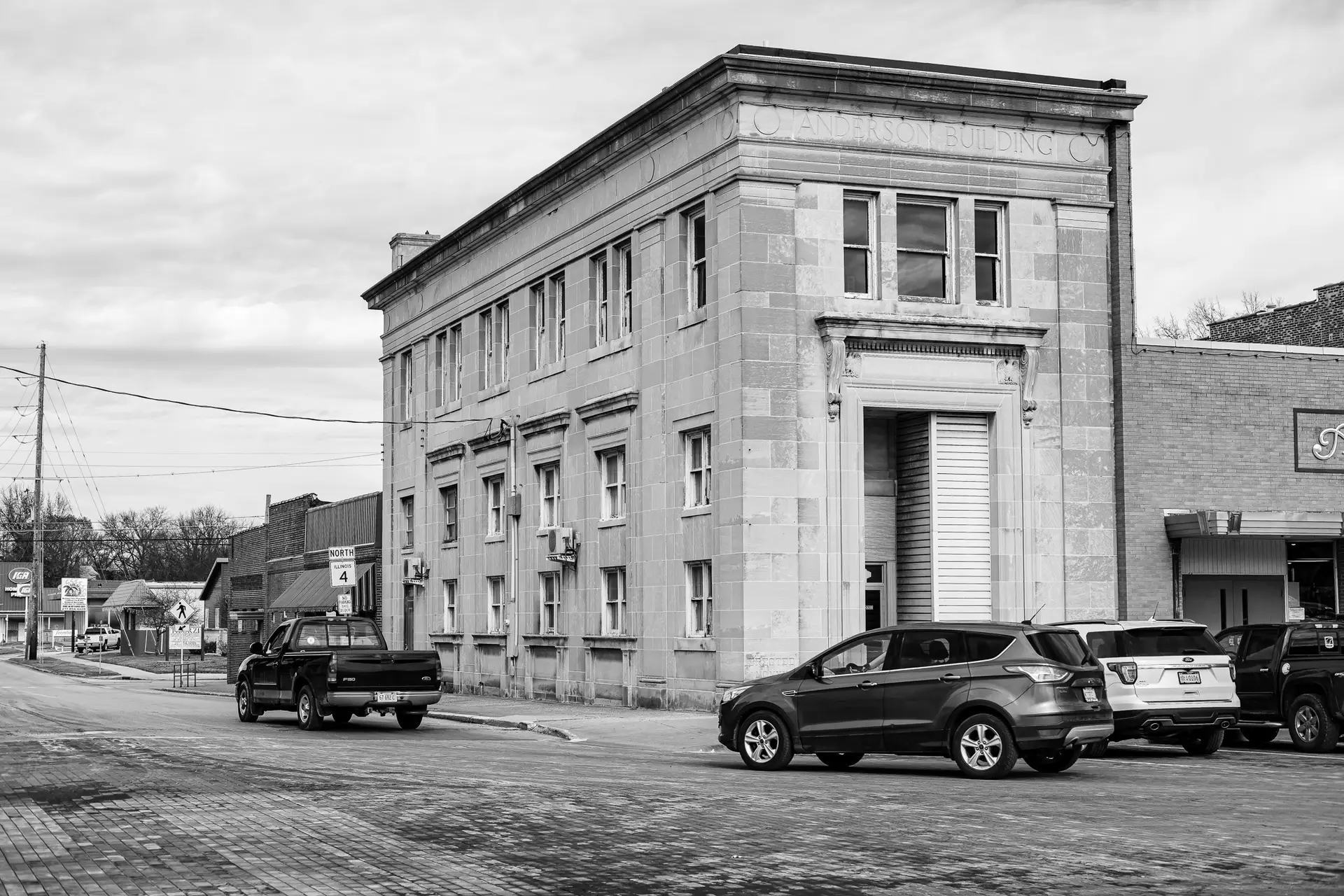 The Anderson Bank Building, built in 1920 for $100,000, still stands like a stone sentinel on Carlinville’s square. Photographed February 3, 2020 © RJL Creative LLC. Use without permission is strictly prohibited.