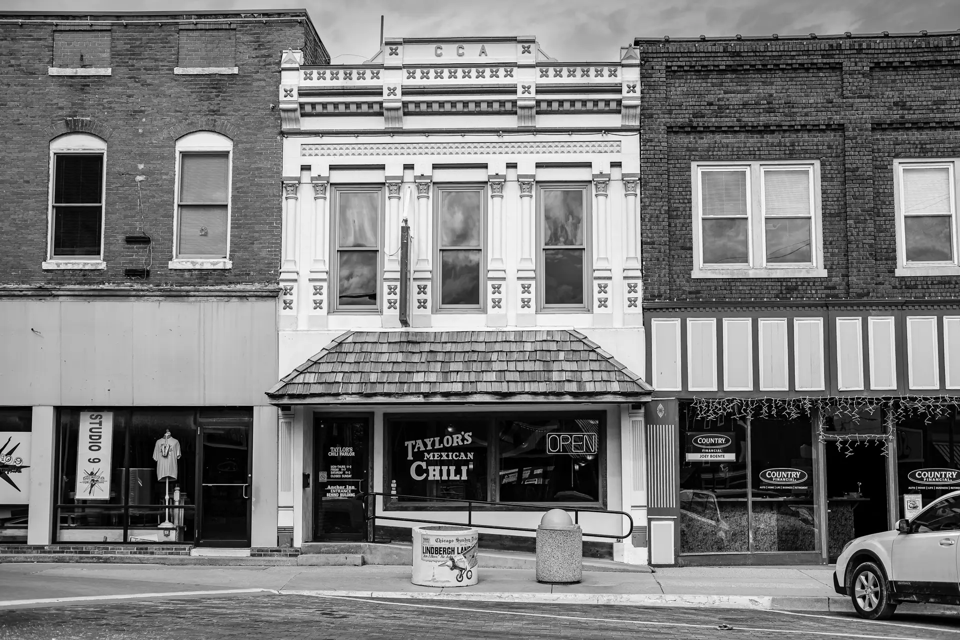 On the north side of the square, Taylor’s Mexican Chili Parlor carries on a tradition that began here in 1904. Charles O. Taylor learned a chili recipe at the St. Louis World’s Fair and brought it home to Carlinville. His parlor became known for fast service, strict rules, and chili that kept people coming back.