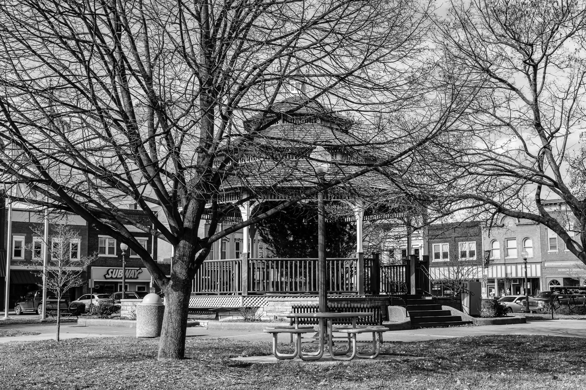 Carlinville’s town square, a green commons with a central gazebo and historic storefronts around it. Photographed February 3, 2020 © RJL Creative LLC. Use without permission is strictly prohibited.