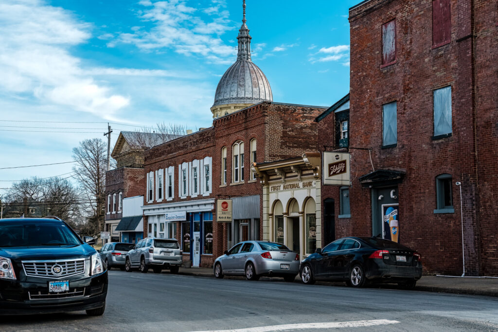 The only time the courthouse dome entered my frame that day was almost by accident. Off in the distance, it rises above the rooftops on East Main. Carlinville’s “Million-Dollar Courthouse,” finished in 1870, earned its nickname when costs ballooned twenty times over budget. It sits a few blocks east of the square instead of at its center, which sets Carlinville apart from most Illinois county seats.