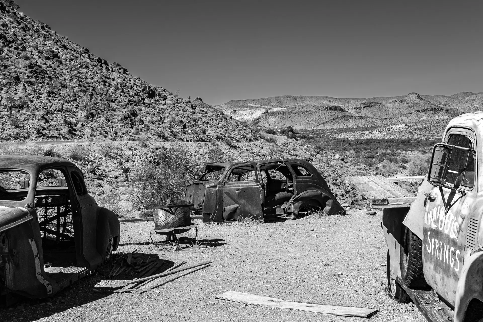 The grounds of Cool Springs hold more than the restored station. Scattered around the property are rusting vehicles that speak to the passage of time. The most notable is an early 1950s Chevrolet pickup, sun-bleached and weathered by the desert air. Despite its condition, the truck remains one of the most photographed objects on the site. Parked near the station, it evokes the years when families relied on vehicles like this to haul themselves and their belongings across the desert. Nearby, the skeletal frame of another stripped-out car rests against the ridge line, its metal slowly breaking down under the relentless sun. These vehicles are no longer tools of transportation. Instead, they have become monuments of memory. Together, they show how the desert can both preserve and consume, freezing a moment in time while slowly reclaiming what was left behind.