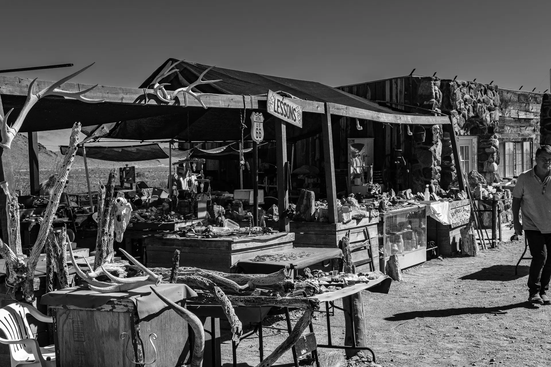 When viewed in black and white, the textures of the stone stand out sharply against the desert ridges behind it. These same walls endured decades of neglect and even the destruction of fire, only to be rebuilt again during restoration. For visitors today, they provide a sense of continuity. They remind us that Route 66 was about more than travel; it was about endurance, adaptation, and survival in a harsh environment. Standing before the building, one can imagine the countless travelers who once paused here before venturing into the twisting road ahead.