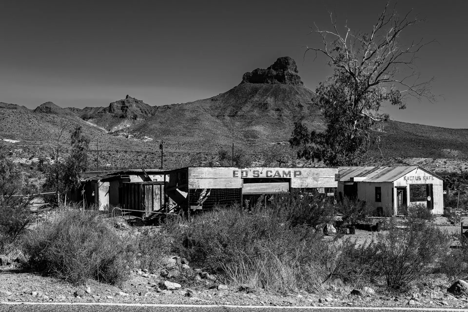 One of my first stops on the morning of October 18, 2020, was in Golden Valley, Arizona, where a mesa rises directly behind Ed’s Camp along the Oatman Highway. The air was hot and smoky from nearby California wildfires, which muted the sky and made it clear that color photographs would be limited. Even so, the desert landscape felt unforgettable in its atmosphere.